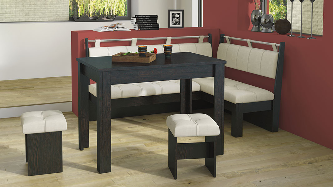 • Обеденная зона "Омега" состоит из удобной угловой скамьи, практичного стола и компактных табуретов.